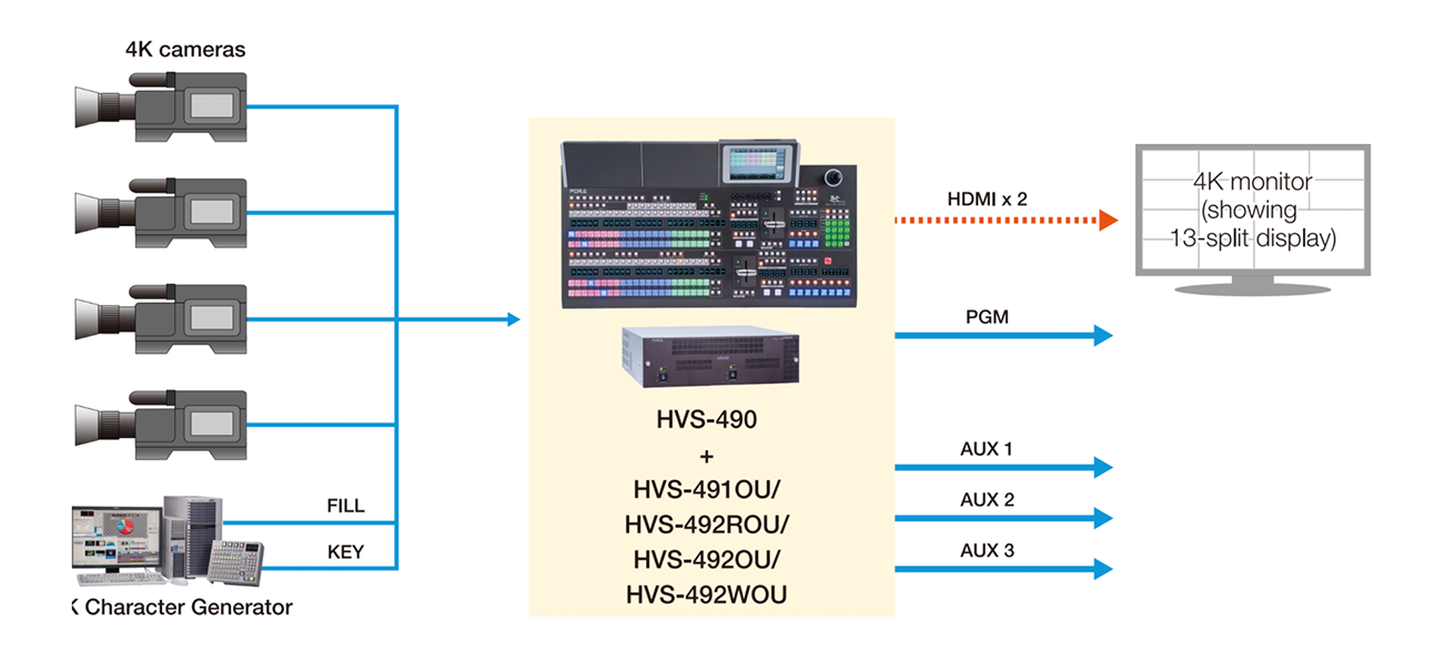 The HVS-490 was designed with future 4K upgrading in mind. By adding optional expansion cards provides up to 10 4K inputs and 7 outputs. What’s more, unique use of AUX buses enables a 4K switcher to have the equivalent of 1–1.5 M/E features.