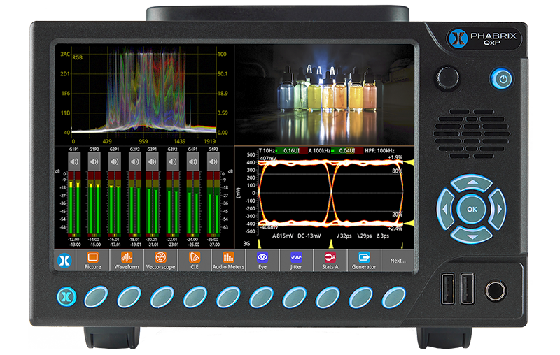 PHABRIX is pleased to present its first example of a traditional ‘Waveform Monitor’ – but with a twist. Inheriting all of the class leading features and flexibility of the QxL Rasterizer the QxP features an integral 3U multitouch LCD screen and an integral V-Mount or G-Mount battery plate, integral mains PSU and 12v external DC input. You now have 12G SDI and 25G ST 2110 compliance monitoring in a portable form factor using industry standard Camera Batteries*.