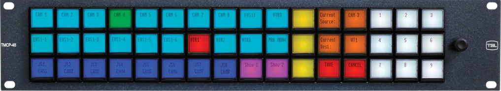 TSL’s range of control panels allows compact system-wide control. Each button is an LCD screen capable of displaying 16 characters or customised bitmaps. The TMCP-48 is a 2U TallyMan Control Panel with 48 TFT user-definable push buttons.