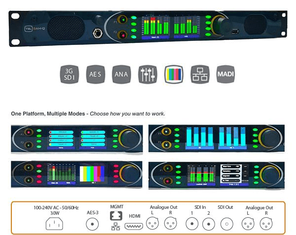 SAM-Q range of audio monitors are unique in their ability to allow you to tailor their operation to the environment in which it will be used. Supporting a number of operational modes which can be enabled and disabled as required, the SAM-Q is equally at home in operational positions in studio facilities to OB trucks, master control positions and playout facilities. With the optional MADI license, SAM-Q-SDI can monitor up to 128 MADI channels, whilst the optional loudness license enables local and remote loudness monitoring of up to 8 independent programs.